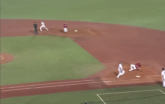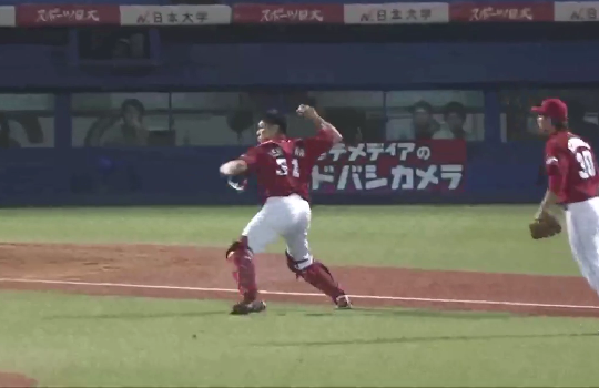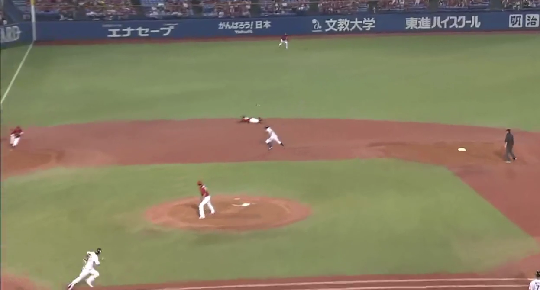 先頭の川端、本日2回めのヒット性の内野ゴロをまた菊池にやられます。