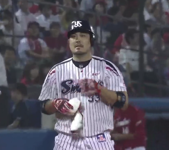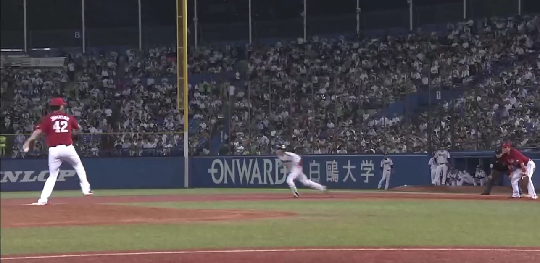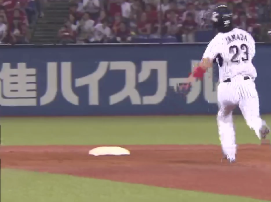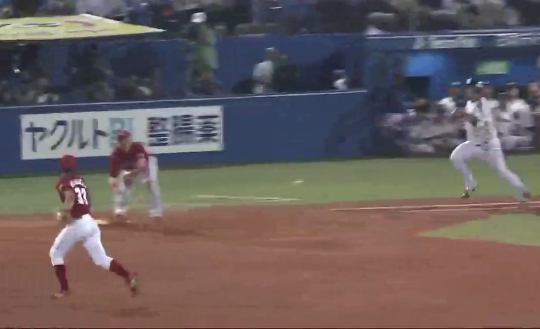ファウルグラウンドにボールが転がる間に俊足山田哲人が生還。