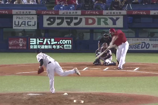 1アウトから、1球目。タイミングをまって、変化球を山田哲人がヒット!