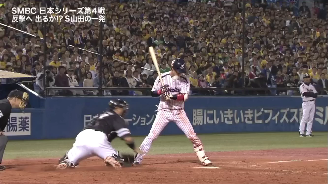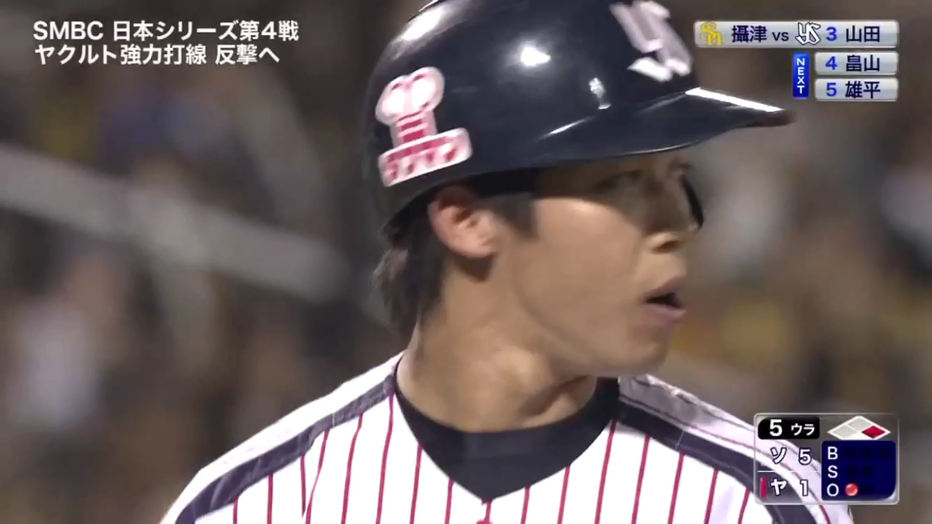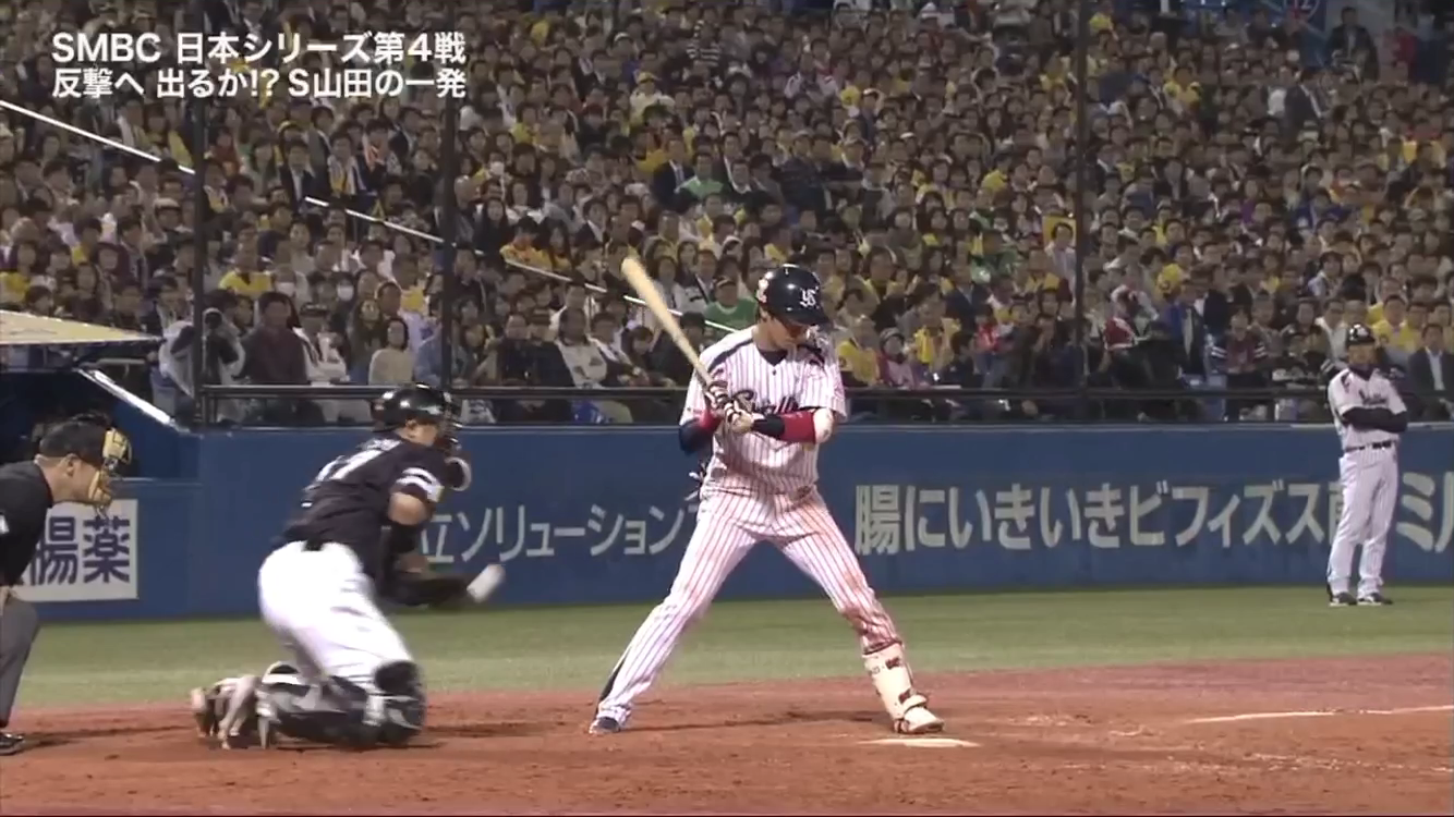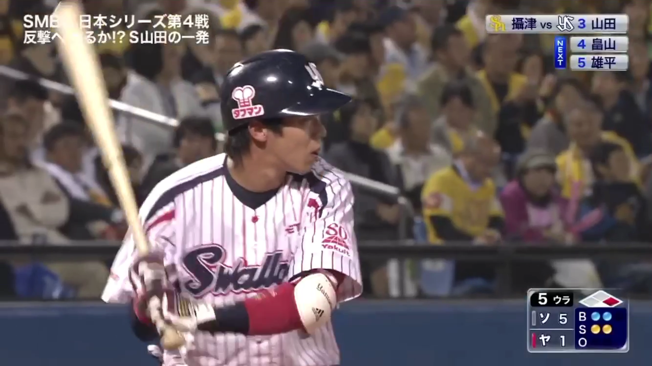 7回の山田哲人の打席では、ノースリーから打って左中間を破るタイムリー2ベースになりました。