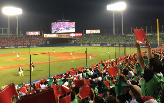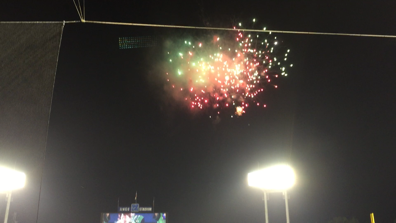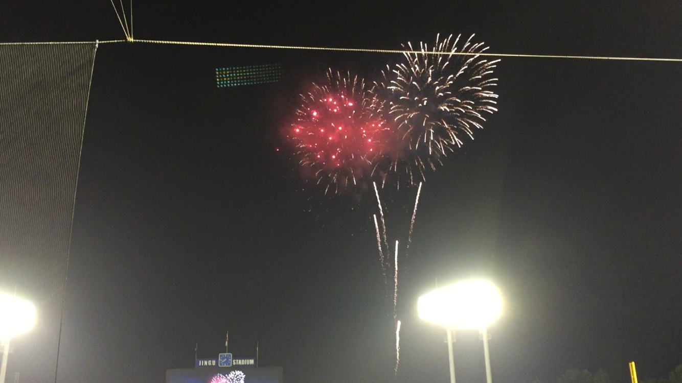ちなみに、上がる花火も「緑と赤」のヤクルト&広島カラーだったんですよ。